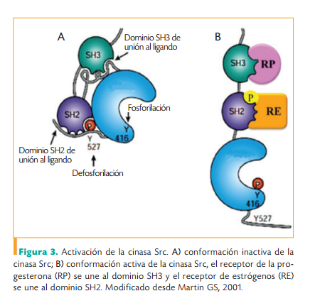 Existen varias enzimas que fosforilan diferentes proteínas que se agrupan bajo el término cinasas. La Src forma parte de la familia de la tirosina cinasa anclada a la membrana celular y es una vía de señalización que hemos estudiado en la regulación de la conducta sexual femenina. Esta molécula tiene la particularidad de que en su estado activo permite la unión del receptor de estrógenos en un sitio de la molécula denominado SH2, y al receptor de progesterona en el sitio SH3 de la misma molécula (Figura 3). Así, una vez formado este complejo enzima/receptores, activará a la MAPcinasa (mapk) para que finalmente fosforile a diversas proteí- nas y en consecuencia se produzca la función celular. El proceso es complejo y, naturalmente, la conducta sexual femenina no es el resultado exclusivo de la fosforilación de un receptor, sino que involucra una serie de cambios en todo el organismo. Sin embargo, a nivel del sistema nervioso central, donde se integra esta conducta, éstos podrían ser los mecanismos involucrados.