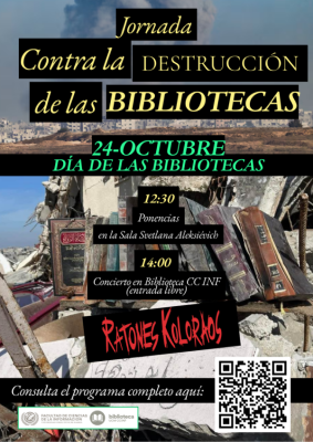Matar las ideas, destruir los libros y destruir a las personas han ido unidos demasiadas veces en muchos otros episodios negros de la historia. Bajo el lema “Contra la destrucción de las Bibliotecas” queremos denunciar en el día de las Bibliotecas cualquier atentado contra el patrimonio bibliográfico, artístico, documental y cultural allá donde se produzca. Del mismo modo que resulta trágica la desaparición de especies animales o vegetales por la acción descontrolada de los seres humanos, la pérdida de parte de la memoria colectiva de la humanidad depositada en las bibliotecas de cualquier parte del mundo resulta irreparable y empobrecedora para nuestra especie. Destruir parte de la tupida red neuronal que forman las bibliotecas de todos los pueblos del mundo, cuya misión es conservar de forma segura y permanente las obras de creación de la humanidad a lo largo de la historia, sólo puede conducir a la demencia, la barbarie y a la autodestrucción de nuestra especie, como también contribuyen a ellas la censura de los libros y de las ideas alimentada hoy con vigor en muchos países, incluso en democracias liberales del llamado primer mundo.